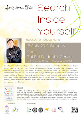 3. Sunday, 8 July, 4pm to 5pm. Mindfulness talk: Search Inside Yourself. Tai Pei Buddhist Center, 2 Lavender St. (Poster below).